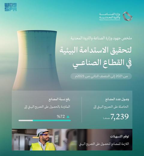 وأوضحت الوزارة إلى أن عدد المصانع الحاصلة على التصريح البيئي بلغ (7239) مصنعًا، مؤكدةً أن الحصول على التصريح البيئي يعد شرطًا أساسيًا لمنح الترخيص الصناعي؛ وذلك تنفيذاً لقرار مجلس الوزراء القاضي بإدراج التصاريح البيئية ضمن الاشتراطات الأساسية لإصدار تراخيص مزاولة الأنشطة ذات الأثر البيئي.